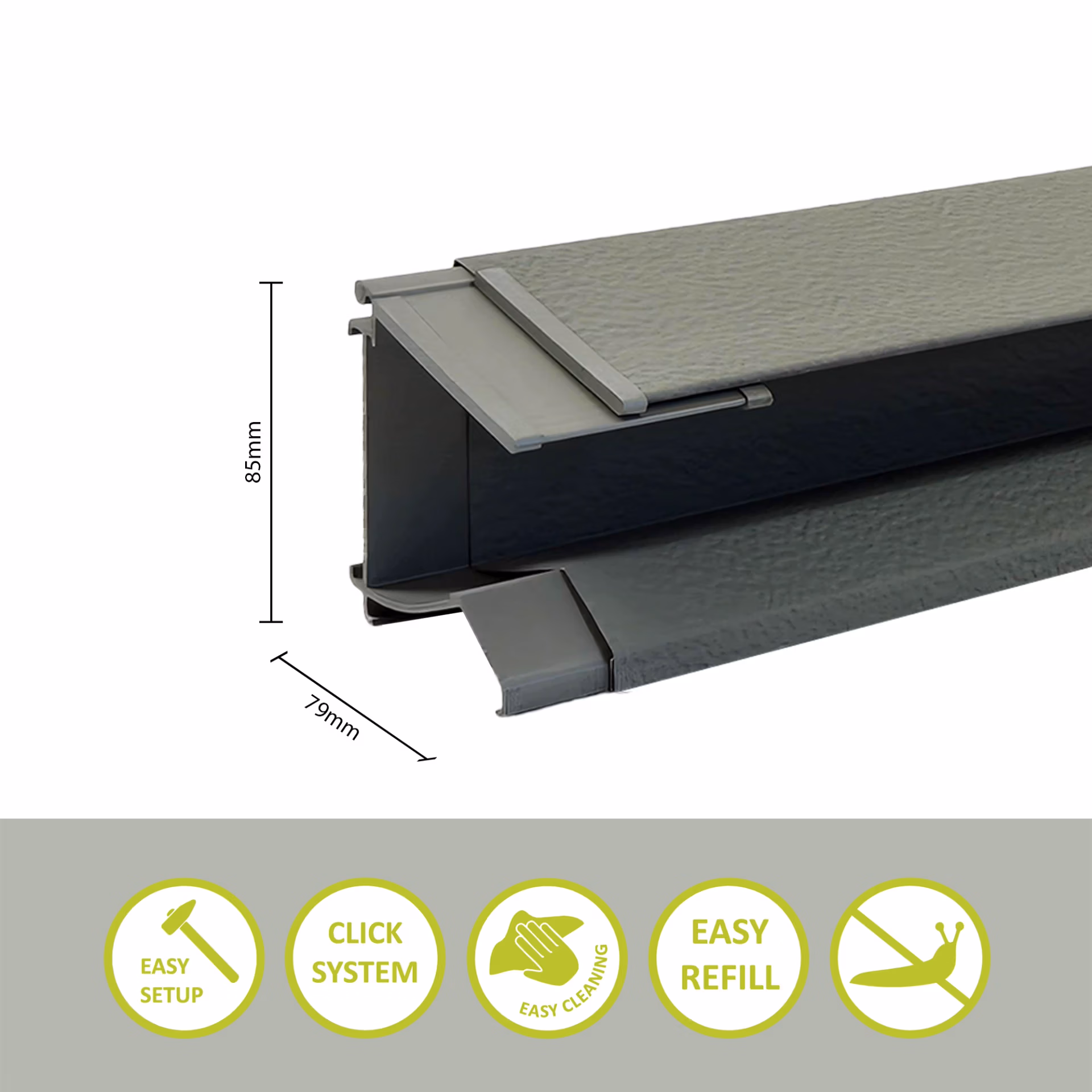 Die integrierte Wanne für Schneckenkorn oder Schneckensalz lässt sich zur einfachen Reinigung herausnehmen. Ein praktischer Klappdeckel sorgt für schnelles und sauberes Befüllen, ohne dass der Zaun demontiert werden muss. An der Rückseite befindet sich eine Aufnahme zur Befestigung an Hochbeeten, sodass der Schneckenzaun flexibel in Ihr Gartenkonzept eingebunden werden kann.